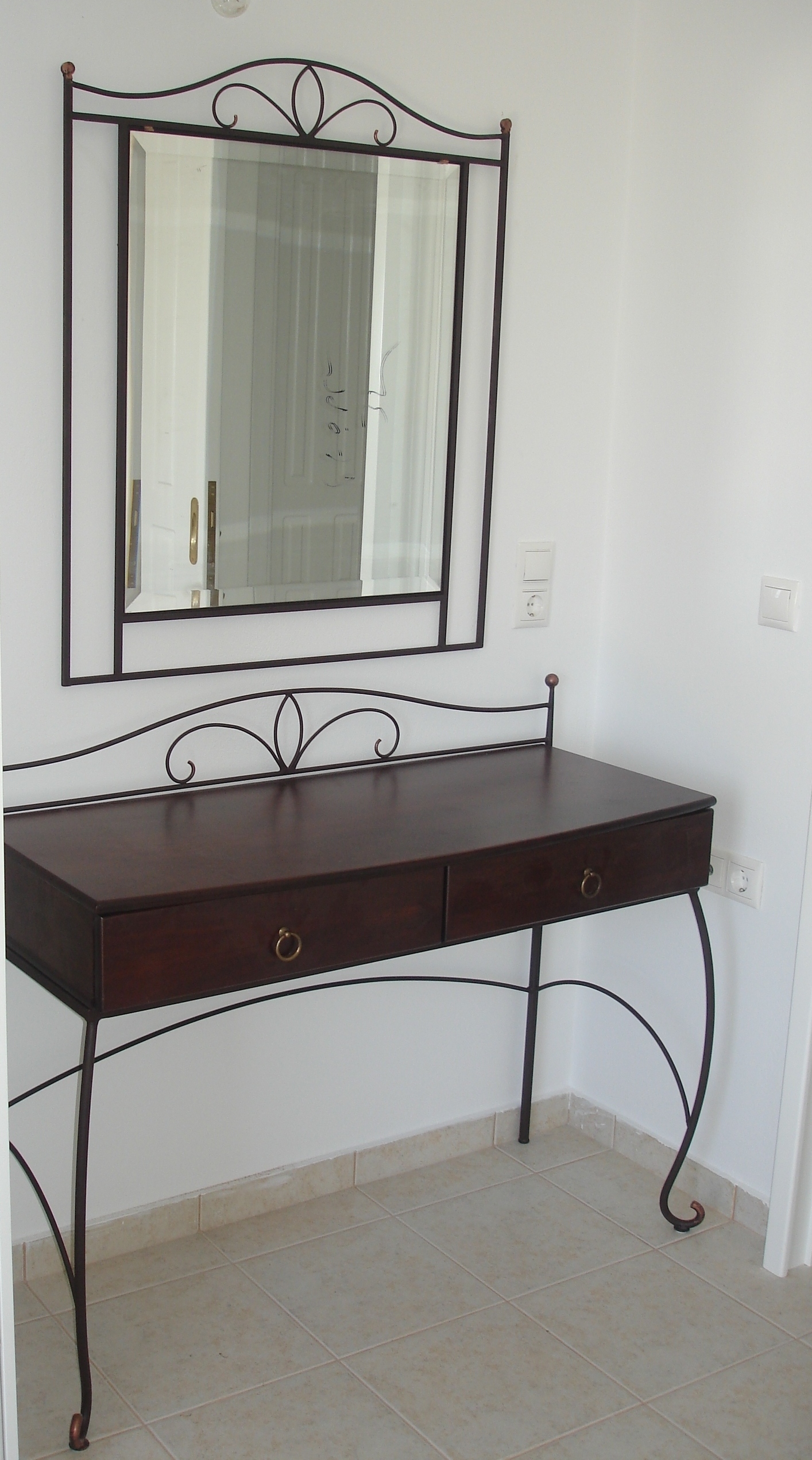 Μεταλλικός ορθογώνιος καθρέπτης με σχέδιο, από μασίφ σίδερο ,και τουαλέτα με μεταλλική βάση και δυο συρτάρια.Το σχέδιο στην πλάτη είναι ανάλογο του κρεβατιού που συνοδεύει.