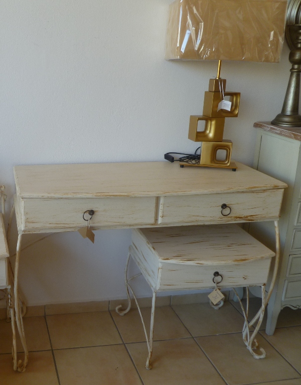 Τουαλέτα και κομοδίνο, με μεταλλική βάση με συρτάρια ,σε μπεζ χρώμα με χρυσή πατίνα. Μπορούν να κατασκευαστούν και με περισσότερα συρτάρια και σε άλλο χρώμα.H τιμή για το κομοδινο είναι 120 ευρώ και για την τουαλέτα 220 ευρω.