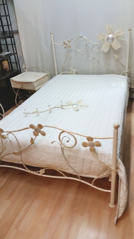 Χειροποίητο μεταλλικό κρεβάτι δουλεμένο εξολοκλήρου στο χέρι.Το σχέδιο του είναι γεμάτο λουλούδια ,σε μπεζ χρώμα, με αποχρώσεις ασημί και χρυσού.Η διάστασή του είναι 120 Χ 200, μπορεί όμως να κατασκευαστεί σε οποιαδήποτε διάσταση και χρώμα.