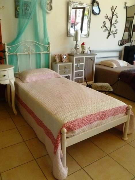 Μεταλλικό χειροποίητο κρεβάτι από μασίφ σίδερο,που στολίζεται από χυτά διακοσμητικά στοιχεία . Η διάσταση του είναι 0,90χ2,00 σε λευκό χρώμα.