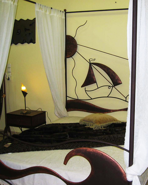 Μεταλλικό χειροποίητο κρεβάτι ,με σφυρήλατο  σχέδιο από μασίφ σίδερο,σε καφέ χρώμα με τελειώματα στο χρώμα του χαλκού.